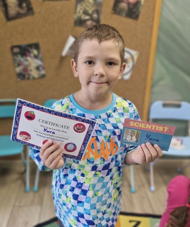 Завершающий день нашей Научной Школы, посвященный кулинарии. Ребята вспоминали названия продуктов, играли в магазин и готовили настоящий фруктовый салат. В конце все участники получили свои сертификаты о прохождении программы, а также карточки-пропуски ученого.